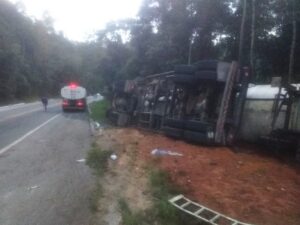 Carreta tomba na BR-262 e carregamento de combustível vai parar em rio