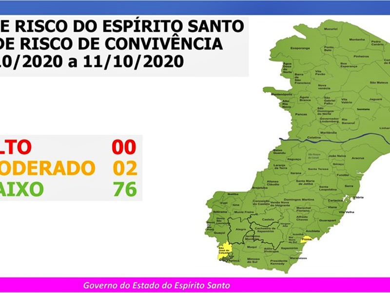 RISCO BAIXO: Afonso Cláudio, Água Doce do Norte, Águia Branca, Alegre, Alfredo Chaves, Alto Rio Novo, Anchieta, Apiacá, Aracruz, Atílio Vivácqua, Baixo Guandu, Barra de São Francisco, Boa Esperança, Bom Jesus do Norte, Brejetuba, Cachoeiro de Itapemirim, Cariacica, Castelo, Colatina, Conceição da Barra, Conceição do Castelo, Divino de São Lourenco, Domingos Martins, Dores do Rio Preto, Ecoporanga, Fundão, Guaçuí, Guarapari, Ibatiba, Ibiraçu, Ibitirama, Iconha, Irupi, Itaguaçu, Itapemirim, Itarana, Iúna, Jaguaré, Jerônimo Monteiro, João Neiva, Laranja da Terra, Linhares, Mantenópolis, Marataízes, Marechal Floriano, Marilândia, Mimoso do Sul, Montanha, Mucurici, Muniz Freire, Muqui, Nova Venécia, Pancas, Pedro Canário, Pinheiros, Ponto Belo, Presidente Kennedy, Rio Bananal, Rio Novo do Sul, Santa Leopoldina, Santa Maria de Jetibá, Santa Teresa, São Domingos do Norte, São Gabriel da Palha, São Mateus, São Roque do Canaã, Serra, Sooretama, Vargem Alta, Venda Nova do Imigrante, Viana, Vila Pavão, Vila Valério, Vila Velha e Vitória.
