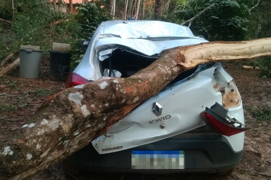 Além dos imóveis destruídos durante o temporal da última quarta-feira (31), uma árvore, entre centenas de outras, que não suportou a velocidade da ventania teve uma rachadura importante pouco acima do nível da terra e despencou sobre um automóvel, destruindo toda a parte traseira do veículo.