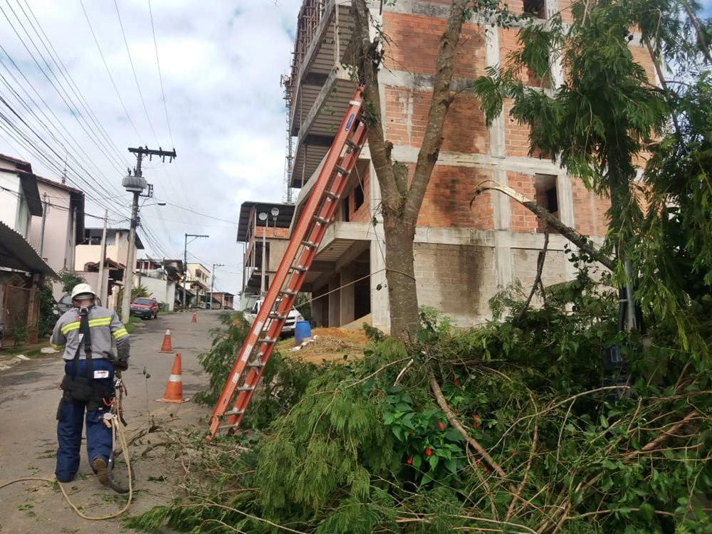 Os homens vestidos adequadamente e com botas alongadas chegaram pela manhã na Rua Cecília Pitanga, após a travessia da linha férrea e encontraram o problema. Uma árvore com os galhos ameaçando a fiação começou a ser decepada pela manhã e antes do meio dia, dezenas de galhos estavam cortados.