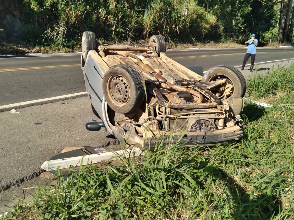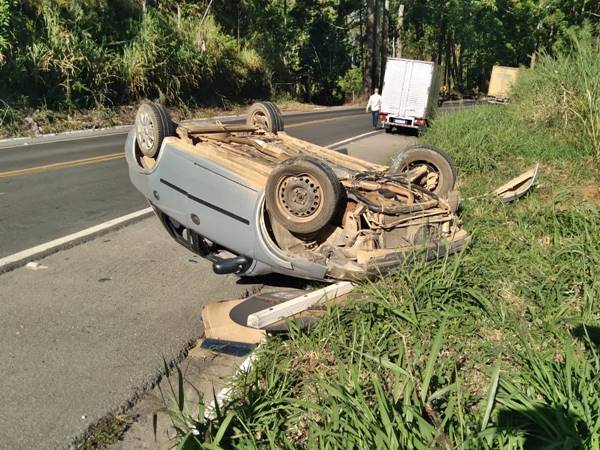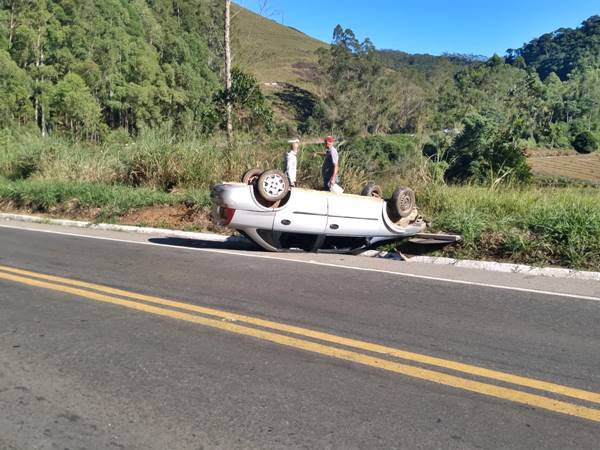 Uma derrapagem do automóvel Chevrolet Corsa, que seguia no sentido Belo Horizonte/Vitória, provocou o tombamento do veículo, que ficou com as rodas para cima no acostamento do km 80 da BR-262, em São Floriano, Domingos Martins. Além disso, a esposa do motorista sofreu ferimentos e foi encaminhada para o Hospital Padre Máximo, em Venda Nova do Imigrante.