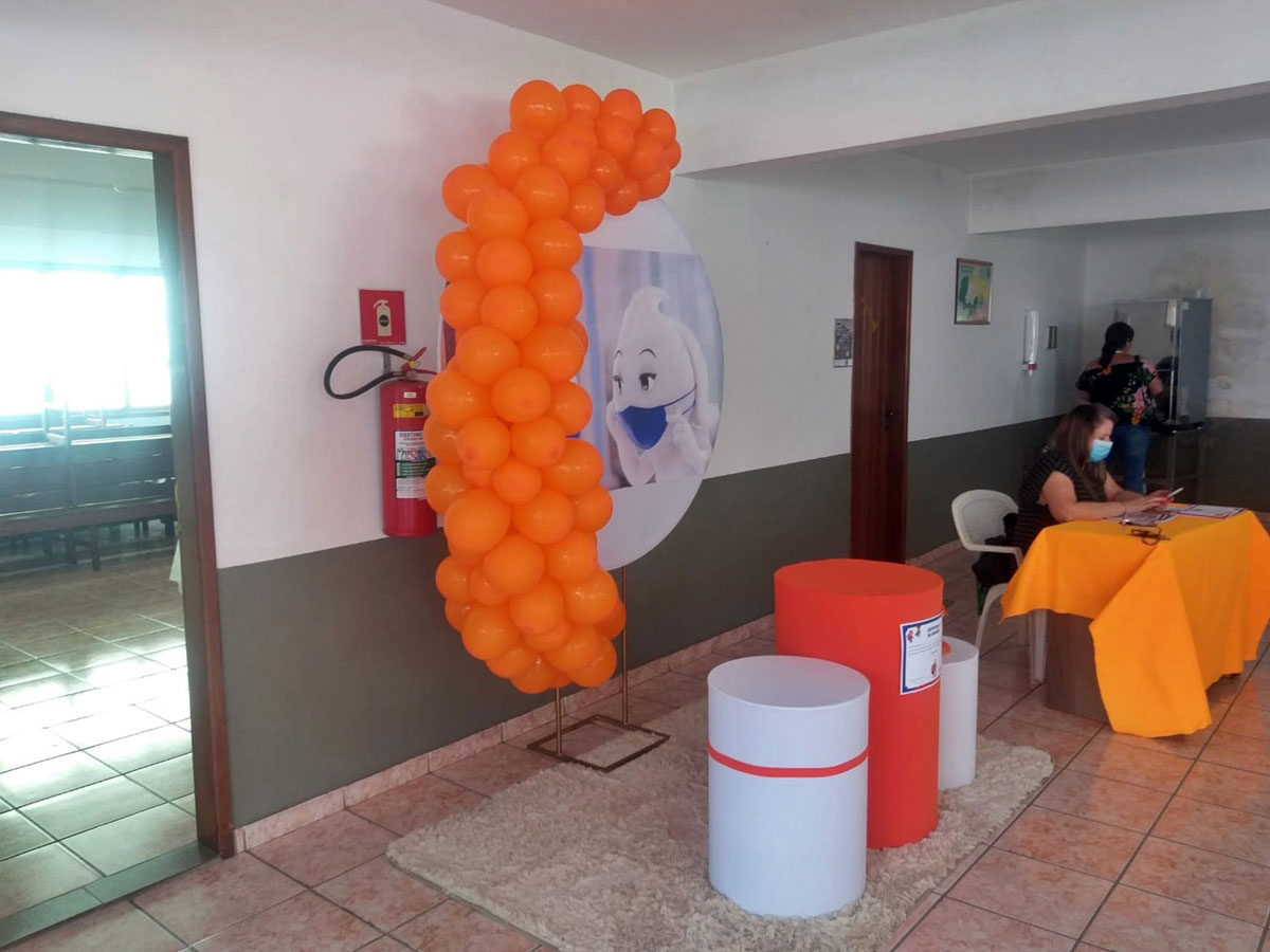 Uma das coisas que mais atraiu a atenção da criançada que foi vacinada foram as dezenas de bolas de soprar de cores amareladas, que juntas, foram postas amarradas umas às outras, como enfeite no grande salão onde aconteceu a vacinação da criançada sob o espaço onde são realizados os cultos.