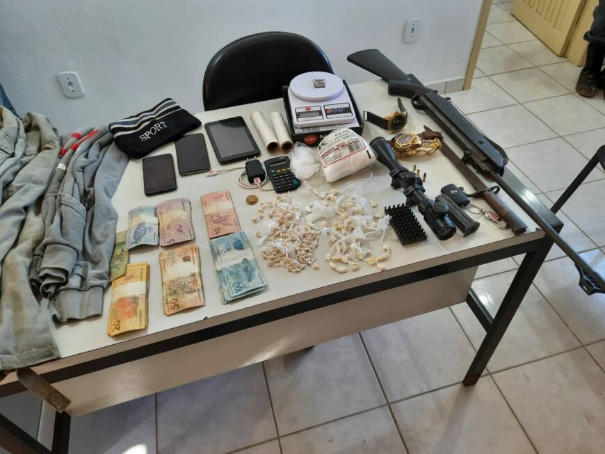 Ao todo, foram apreendidas 143 pedras de crack, 62 papelotes de cocaína, material para embalo e comércio de entorpecentes, R$ 1.314,05 em dinheiro,
