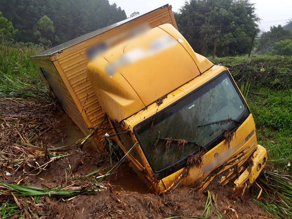 Caminhão de entregas tomba em rodovia estadual durante fortes chuvas
