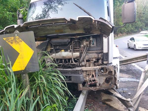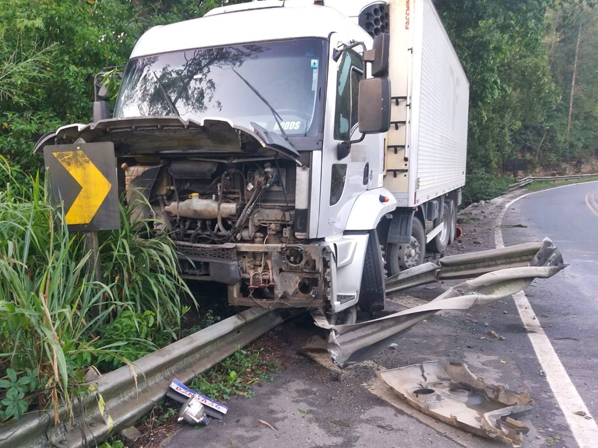 Um caminhão-baú, que seguia da sede de Domingos Martins para o distrito de Aracê, onde carregaria de alimentos vegetais, ficou descontrolado em uma curva, no quilômetro 48 da BR-262, em Barra de Rio Fundo, Marechal Floriano, e ficou com a frente destruída ao colidir com a proteção lateral de uma ponte.