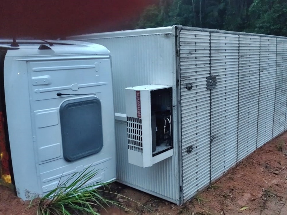 Caminhão frigorífico tomba na BR-262 após evitar batida com outro veículo