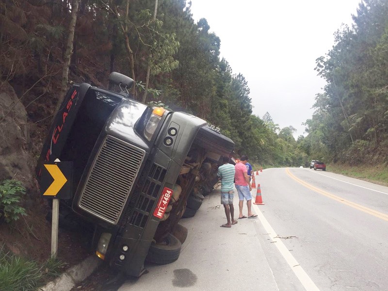Uma carreta carregada de farelo de soja, placas MTL-4484 (Domingos Martins), tombou na BR-262 no final da manhã desta segunda-feira (6). O acidente aconteceu no km 91 da rodovia, quase na entrada de Pedra Azul, numa subida seguida de uma curva pouco acentuada.