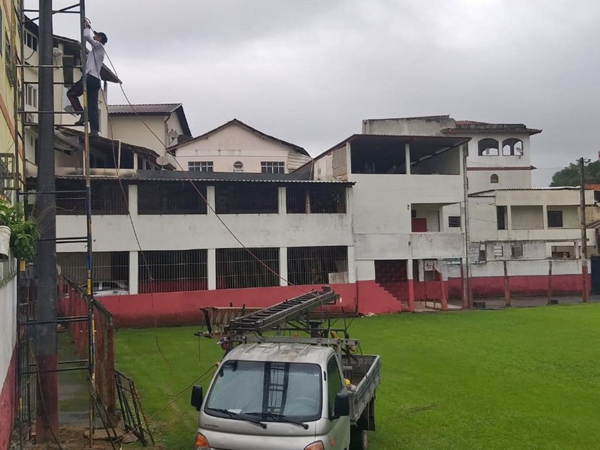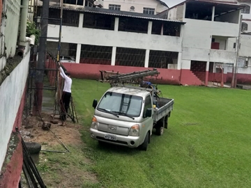 Uma equipe de eletricistas trabalha desde a manhã desta quarta-feira (10), sob chuva constante, na instalação de refletores do modelo “LED” colocados nos postes existentes no Estádio José Henrique Pereira, o conhecido por “Campo do América Futebol Clube”.