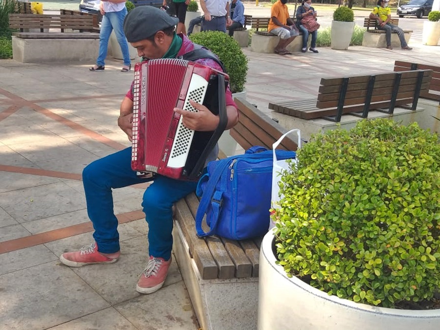 Capixaba toca acordeão com músicas gaúchas sem aglomerações na pracinha de Marechal Floriano