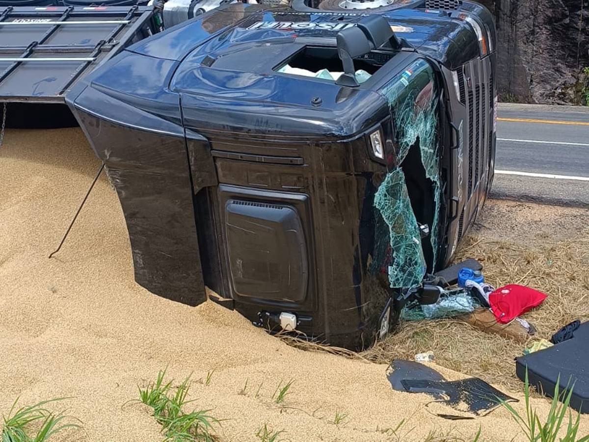 Uma carga de cevada, que era transportada do Porto de Vitória, na capital capixaba, para Minas Gerais, ficou espalhada às margens do km 34 da BR-262, na entrada ao distrito de Biriricas, em Domingos Martins, após uma carreta tombar em um trecho de curva.