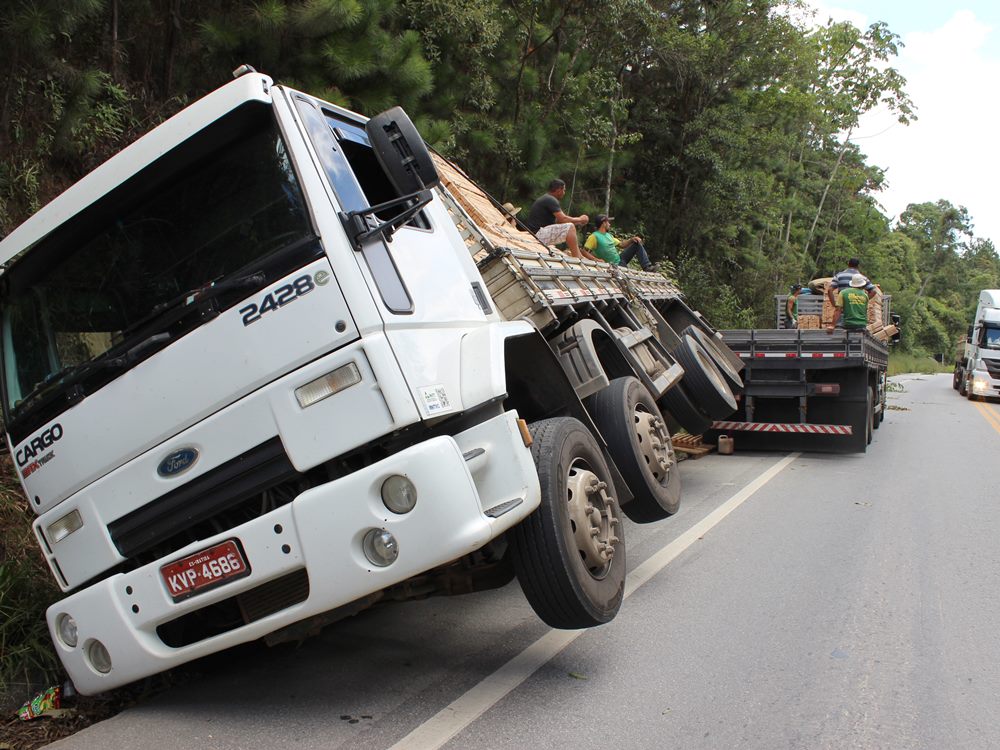 Um caminhão que transportava entre 15 e 16 toneladas de eucalipto, já cortado, tombou por volta das 5 horas da manhã, desta quinta-feira (23), na BR 262, em um trecho próximo ao quilômetro 91, na localidade de Pedra Azul, em Domingos Martins.