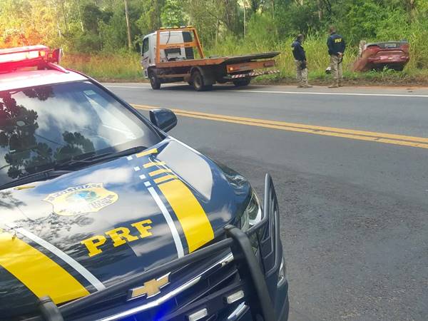 Uma equipe formada por dois agentes da Polícia Rodoviária Federal (PRF), que estavam a caminho de Ibatiba, onde assumiram o serviço na manhã de terça-feira (26), foi surpreendida por um carro tombado à margem da BR-262. O veículo ficou bastante destruído devido ao acidente.