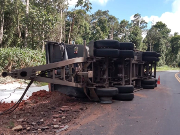 No acidente desta manhã, o carreteiro saiu ileso na ocorrência. Tudo indica que parte da carreta se soltou do restante do veículo e tombou. Mas na parte frontal do veículo onde fica a cabine, não houve amassamentos e o motorista saiu ileso.