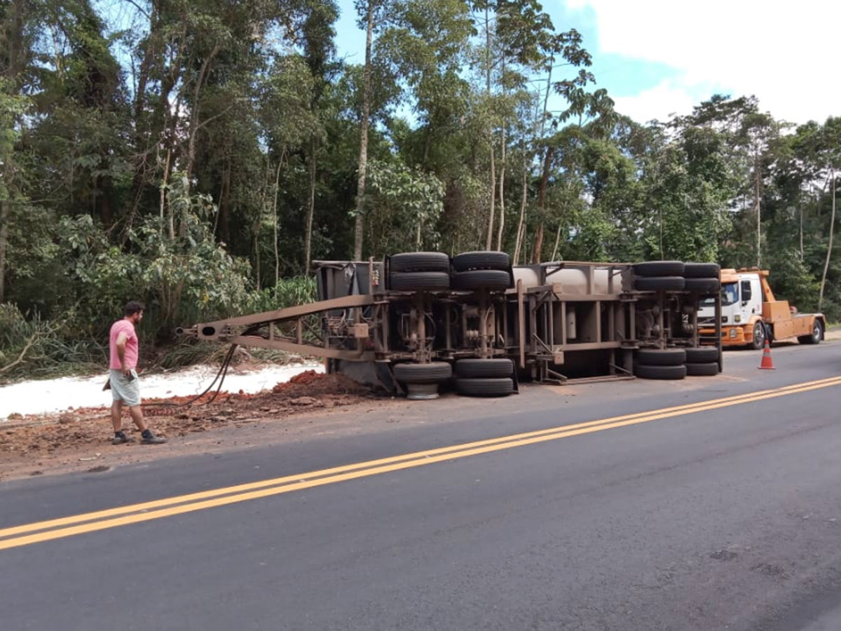 Carroceria com carregamento de adubo agrícola se solta de carreta e tomba na BR-262