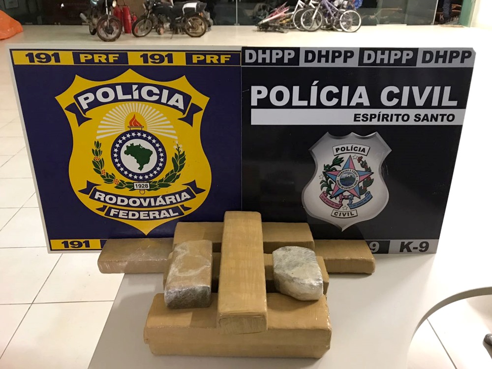 A equipe, que realizava um trabalho de combate o narcotráfico na via, abordou o veículo que fazia o itinerário Belo Horizonte-Vitória, por volta das 17 horas. Com a ajuda de cães farejadores, foram encontradas no bagageiro externo do ônibus, duas malas com vários tabletes da droga, que após serem pesados se aproximavam de 9,92 quilos.