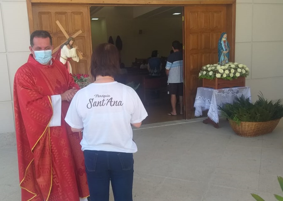 Já no domingo, apenas 15 católicos assistiram a missa diretamente na Matriz de Sant’Ana e centenas pelas redes sociais em suas residências. O Domingo de Ramos foi lembrado pelo pequeno grupo que levou para casa os ramos que foram bentos durante a missa pelo padre Marcos Brito.