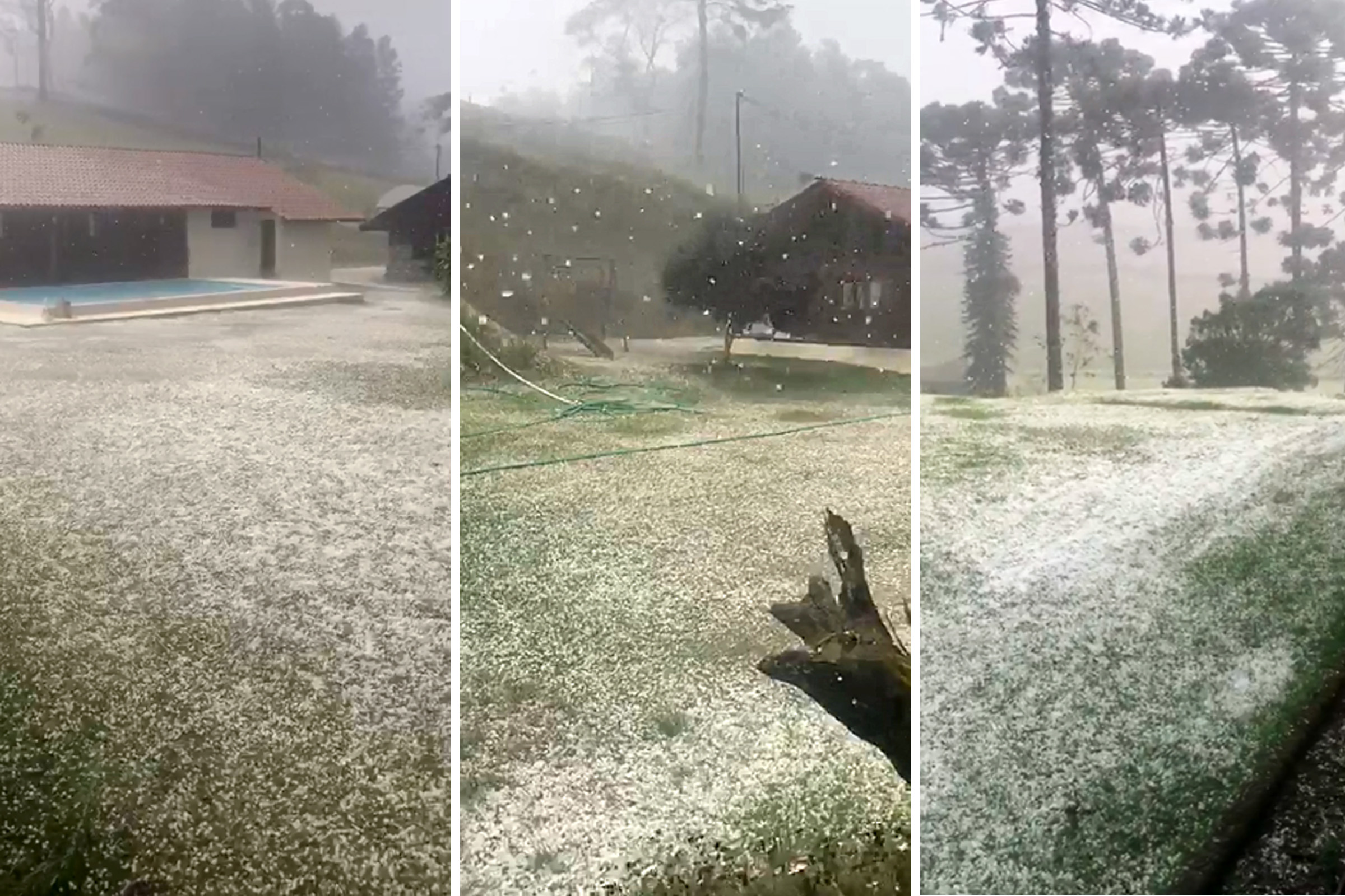 O calor de aproximadamente 30 ºC do dia de hoje (29) já caiu para cerca de 18 ºC no final da tarde na região de Pedra Azul, em Domingos Martins. O motivo foi uma intensa chuva de granizo que caiu em algumas localidades. Clique aqui e veja os vídeos na matéria da Revista Negócio Rural.