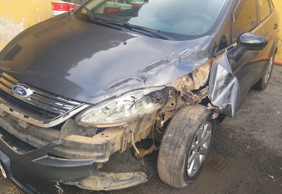 Um veículo Renault modelo Duster e um automóvel Ford Fiesta destruídos parcialmente em uma estrada vicinal de Domingos Martins. Este foi o resultado de uma colisão entre os dois carros que seguiam pela via que liga o distrito de Ponto Alto à Tijuco Preto, após o distrito de Paraju.