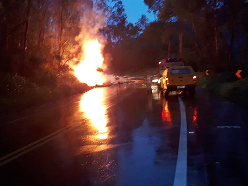 Os agentes da Polícia Rodoviária Federal (PRF) Márcio e Quintela registraram a ocorrência e controlaram o trânsito após os bombeiros controlarem as chamas, com mais de três metros de altura.