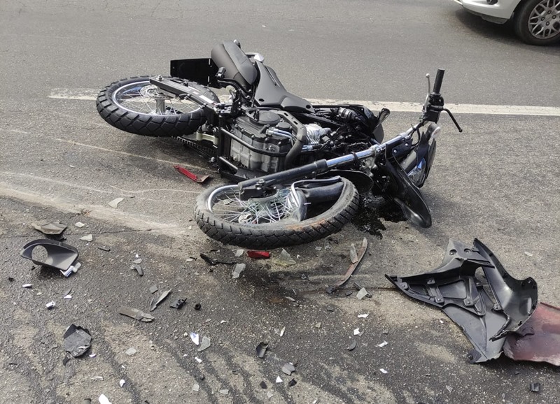 Um homem ferido em uma motocicleta Honda modelo 380 cilindradas destruída parcialmente em uma colisão com um carro Fiat Uno, no início da tarde desta sexta-feira (31). O acidente aconteceu no quilômetro 38, da Rodovia BR-262, próximo ao trevo de acesso ao distrito rural de Biriricas, em Domingos Martins.