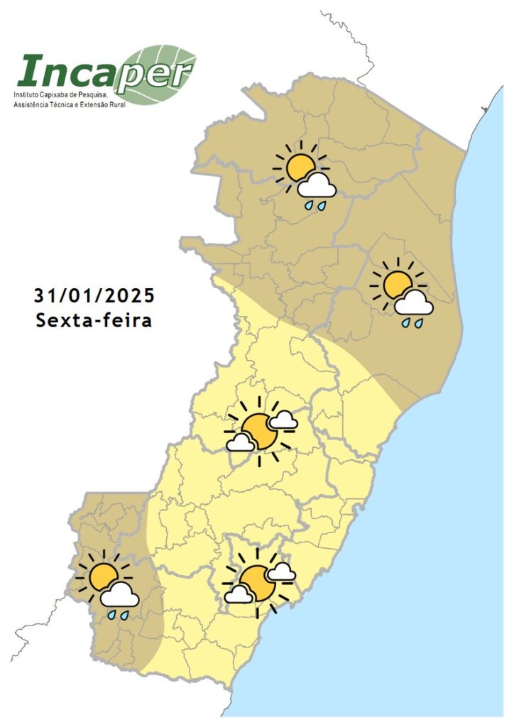 Sexta-feira (31) será de sol com variação de nuvens em todo o Espírito Santo. No litoral norte capixaba, o céu ficará nublado pela manhã, com possibilidade de chuva rápida, mas o tempo abre ao longo do dia. Na região do Caparaó, o sol predomina pela manhã, com aumento de nuvens à tarde e previsão de pancadas de chuva. Na Região Noroeste e no extremo norte, o dia começa com sol, seguido por aumento de nuvens e chuva esparsa à tarde. Nas demais regiões, o sol aparece entre poucas nuvens, sem previsão de chuva. As temperaturas seguem elevadas em todo o Estado, conforme informou o Instituto Capixaba de Assistência Técnica e Extensão Rural (Incaper).