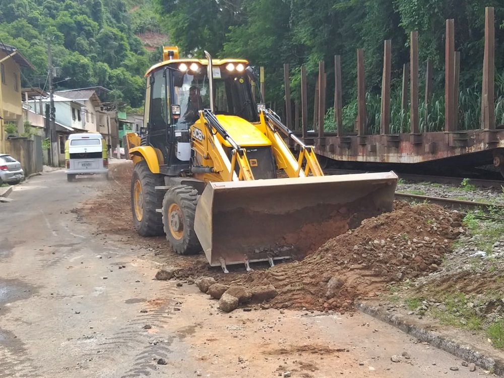Uma equipe com retroescavadeira, caminhões e ferramentas manuais continua removendo as peças metálicas ao lado da linha férrea, onde está sendo construída uma duplicação da via pública, conhecida por Rua da Linha, entre a sede de Marechal Floriano e o Bairro Poço Fundo, trecho também denominado por Rua Delimar Schunk.