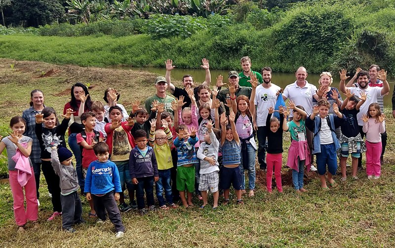 Depois dessa aula sobre meio ambiente, as crianças tiveram uma atividade prática com o plantio de 85 mudas de árvores nativas da Mata Atlântica. A turminha botou as mãos na terra para colaborar com a recuperação da mata ciliar nas margens do Rio Jucu. Os alunos gostaram tanto da experiência que pretendem batizar as árvores recém-plantadas. Elas também poderão acompanhar o desenvolvimento das mudas fincadas na propriedade rural do senhor Romildo Simmer, vizinha à escola de Goiabeiras. Ao final das atividades, as crianças receberam cartilhas informativas do Instituto Ibramar. Houve também o sorteio de brindes.
