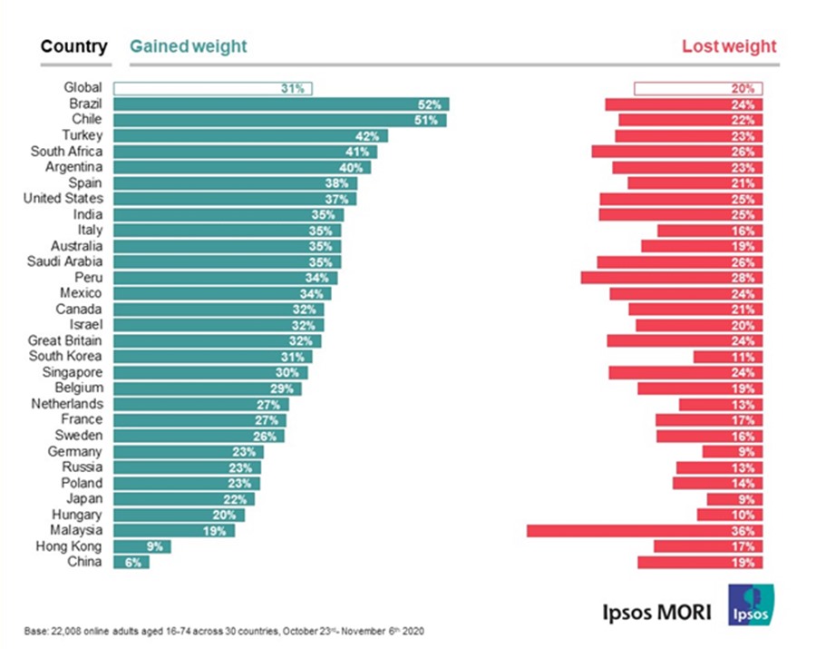 Na média global, pouco menos de 1 em cada 3 entrevistados (31%) engordou durante o período. Logo atrás do Brasil, os países que mais lidaram com os quilos extras foram o Chile (51%) e a Turquia (42%). Em contrapartida, os asiáticos China (6%), Hong Kong (9%) e Malásia (19%) foram os que melhor conseguiram manter a forma. Entre as pessoas que engordaram, considerando todas as nações, o aumento de peso médio foi de 6,1 kg. No Brasil, foram 6,5 kg quilos a mais.