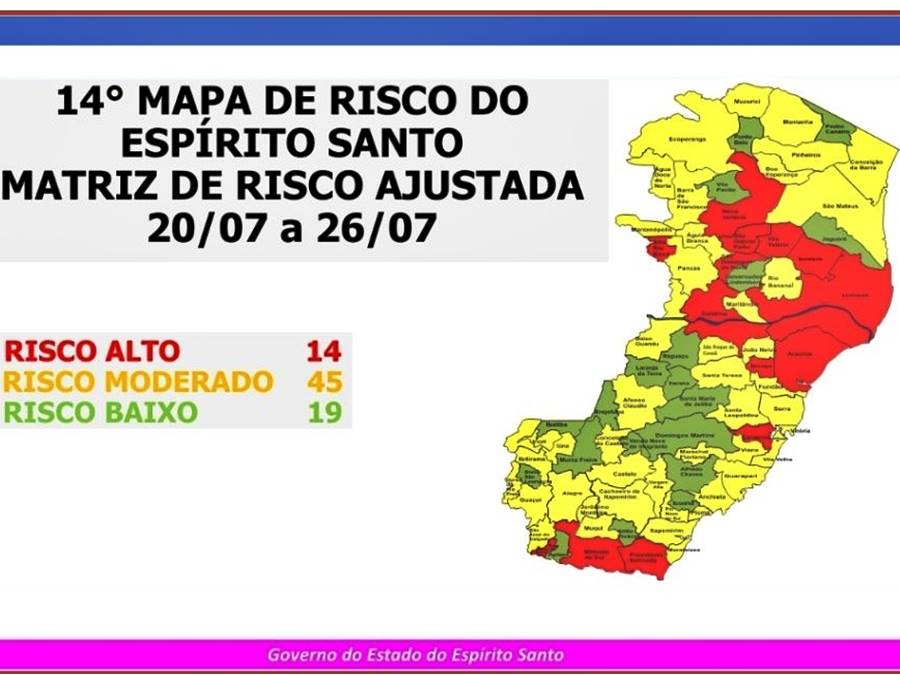 Dezenove municípios retornaram ao nível de risco baixo para transmissão do novo coronavírus no Espírito Santo. O anúncio foi feito, neste sábado (18), pelo governador Renato Casagrande, durante a apresentação do 14º Mapa de Risco Covid-19, que entra em vigor na próxima segunda-feira (20) e tem validade até o domingo (26). Com isso, 14 municípios permanecem em risco alto e outros 45 em risco moderado. Clique aqui e veja a lista na matéria do portal da Revista Negócio Rural.