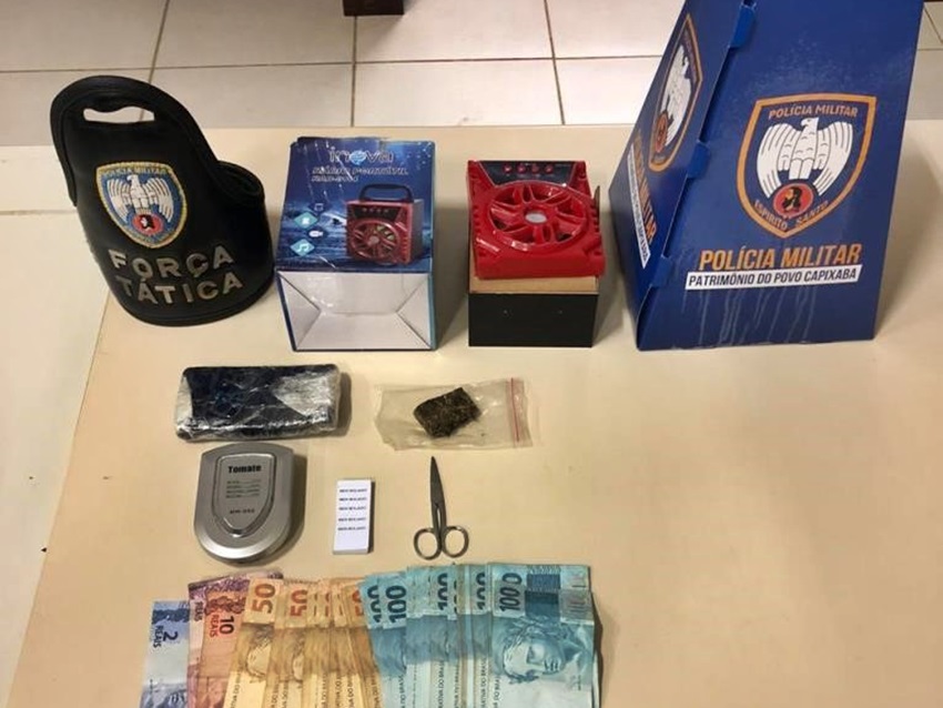 Foram realizadas as abordagens e com um dos abordados foi localizado um pedaço de maconha e R$ 2.650,00 em espécie, além de uma tesoura com resquícios de entorpecente. Com outro homem foi localizada uma caixa de som que o abordado havia acabado de receber da agência dos Correios, no momento a caixa de som exalava um forte odor característico de entorpecente, a caixa foi desmontada e no seu interior os policiais militares localizaram 107,4 gramas de haxixe. No veículo foi encontrada uma balança de precisão, R$ 32,75 e material de identificação utilizado para personalização da droga a ser vendida.