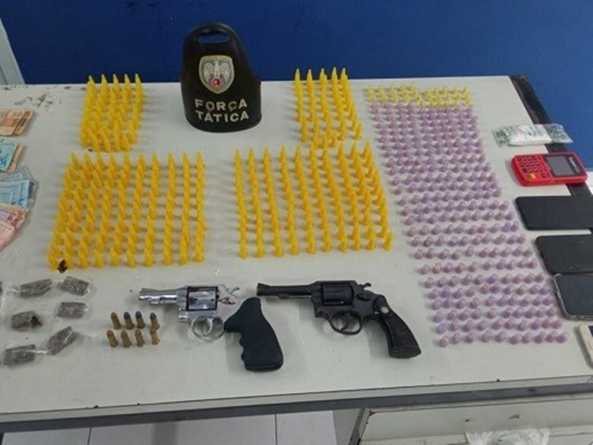 Durante os procedimentos, os militares apreenderam dois revólveres calibre 38, oito munições calibre 38, quatro aparelhos celulares, 275 pedras de crack, 287 pinos de cocaína, nove buchas de maconha, R$978,00, máquina de cartão de crédito e materiais para embalo.