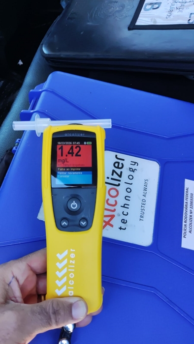 O teste do etilômetro confirmou a gravidade da situação: 1,42 mg/l de álcool por litro de ar alveolar, quantidade quase cinco vezes acima do limite legal e índice que configura crime de trânsito.