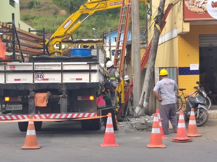 Energia elétrica é restabelecida após manutenção de poste derrubado por carreta