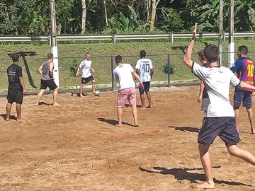 Escola de Marechal Floriano encerra o ano letivo com alunos batendo bola em campo de areia