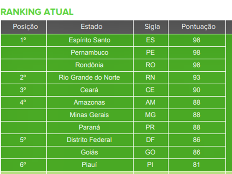 O Estado, que já ocupava a terceira posição nas últimas avaliações, com nível de transparência classificado como alto, chegou ao 1º lugar ao passar a divulgar boletim diário com o número de leitos ocupados e a apresentar dados sobre a ocorrência de outras doenças respiratórias. A pontuação do Espírito Santo passou de 93 a 98 (de um máximo de 100 pontos).