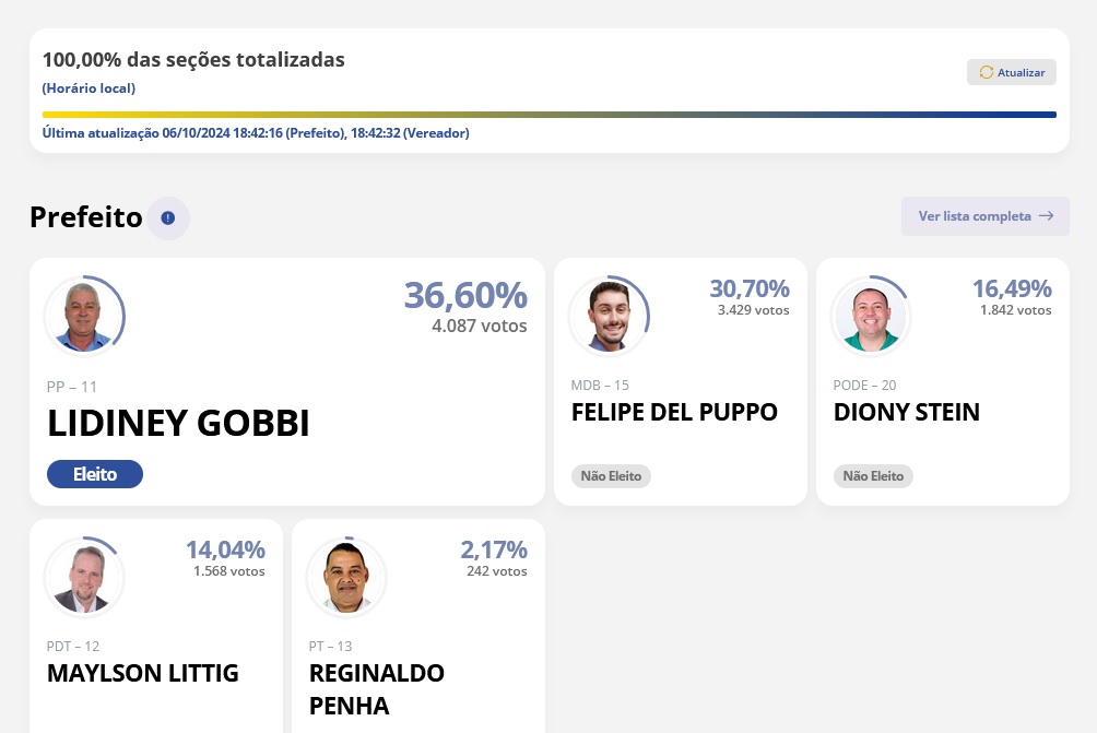 O ex-prefeito Lidiney Gobbi (PP) foi eleito novamente em Marechal Floriano e comandará o Executivo Municipal pela segunda vez, juntamente com seu vice, Junior Lovatti (PL). Com 4.483 votos, o que corresponde a 36,60% dos votos válidos, Lidiney governará o município até o final de 2028.