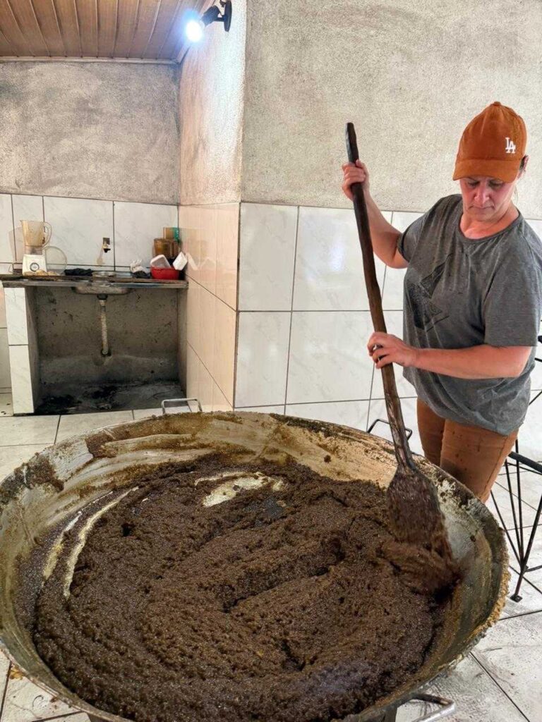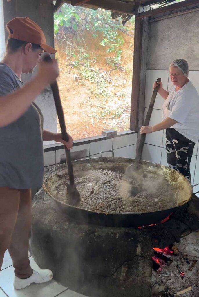 Tudo é feito de forma artesanal, com o cuidado e a dedicação de quem aprendeu desde cedo o valor do trabalho no campo. A cana é cultivada, colhida e moída no próprio sítio, e o processo segue como era feito pelos antepassados: o caldo é fervido lentamente em grandes caldeirões aquecidos a lenha, até atingir o ponto exato. Só então entram o mamão e o gengibre, que dão sabor e aroma característicos ao doce.