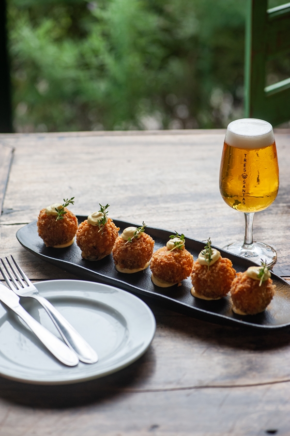 - Bolinho cremoso de arroz arbóreo com parmesão, gemas de ovos, pimenta do reino, muçarela. Acompanha aioli de alho. Sugestão de harmonização Italian Pilsner
