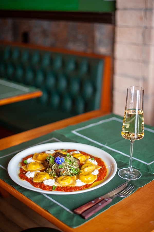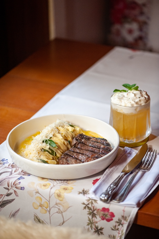 - Ravioli Recheado de Espinafre e Ricota, sobre o molho sugo de stracciatella, acompanhado de filé ao pesto. R$ 110,00 – individual