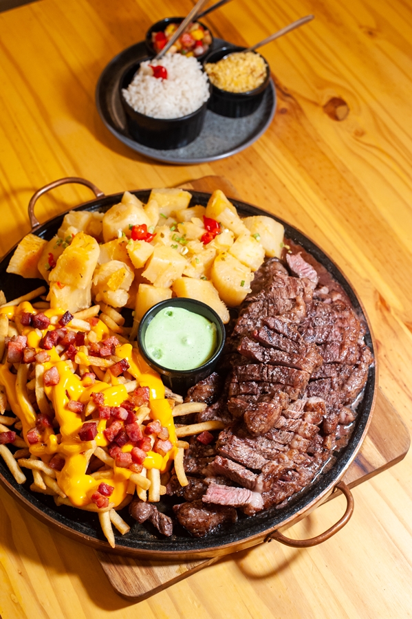 - Picanha do Patrão: 1kg de picanha, com Batata frita com queijo e bacon, Aipim Cozido, Farofa, vinagrete e Arroz Serve até 6 pessoas Valor R$269,00