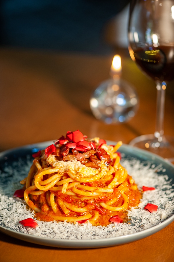 - Massa tradicional de Roma: bucatini, molho a base de tomate fresco, passata, pimenta calabresa, pecorino romano, guanciale e vinho branco