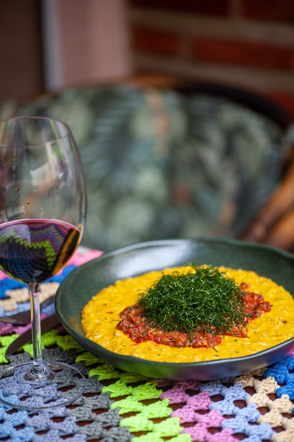 - Risoto de abóbora com gorgonzola, acompanhado de ragu de carne seca e couve crispy
