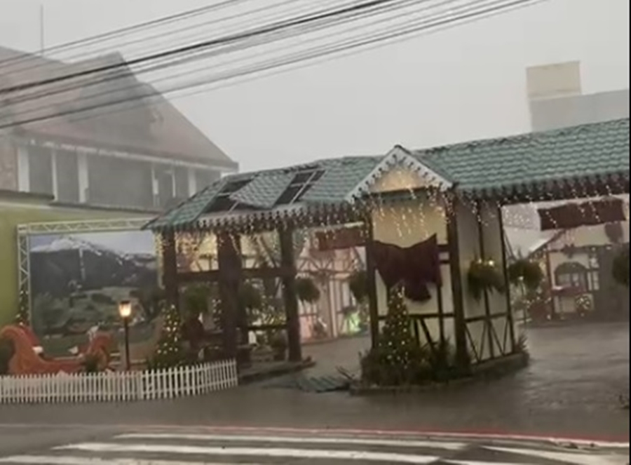 De acordo com moradores e relatos de redes sociais, as ruas do centro e de diversas localidades rapidamente se transformaram em “rios”, com a enxurrada arrastando galhos e detritos e invadindo casas. Em muitos casos, a água subiu em questão de minutos, atingindo móveis, eletrodomésticos e bens pessoais. Até mesmo a Vila do Papai Noel (foto), construída especialmente para incrementar o turismo da cidade nesta época do ano, sofreu avarias no telhado do seu portal de entrada devido aos fortes ventos.