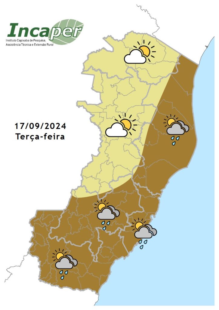 A terça-feira tem mudança nas condições do tempo devido a passagem de uma frente fria. Trechos da metade sul do estado e da região Nordeste tem aumento de nuvens ao longo do dia com chance de chuvas fracas e isoladas, assim a temperatura diminui um pouco nessas áreas. Nas demais áreas o sol predomina, sem chuva. O vento sopra com moderada intensidade por todo o litoral capixaba e são esperadas rajadas no litoral da região Sul.