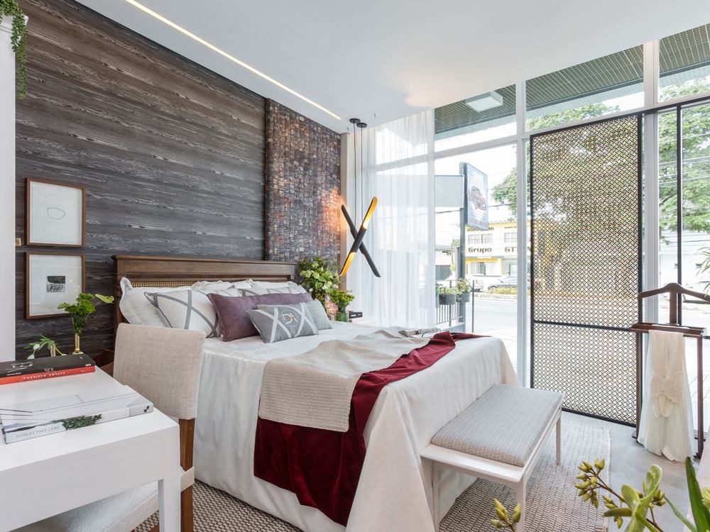 O quarto conta com o mix de rusticidade e modernidade preciso para sentir o aconchego e admirar a beleza inspirada nas montanhas capixabas. Para aproveitar o clima frio típico da região, Daniela pensou em uma lareira nada convencional, além de priorizar a praticidade, para que o quarto pudesse se adequar a qualquer região. “Propus uma lareira conceitual que irá compor uma parede galeria, priorizei o mobiliário solto reduzindo assim demolições, reformas e resíduos”, comenta.