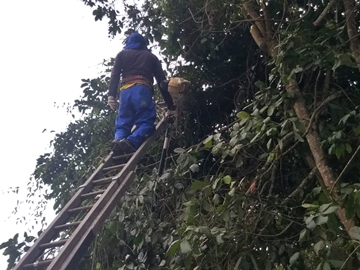 Uma equipe técnica da municipalidade realiza um trabalho de corte de galhos de árvores que ameaçam os moradores da cidade e visitantes que caminham no calçadão às margens da Rodovia BR-262. As partes perigosas se encontram nas árvores que medem mais de dez metros de altura.