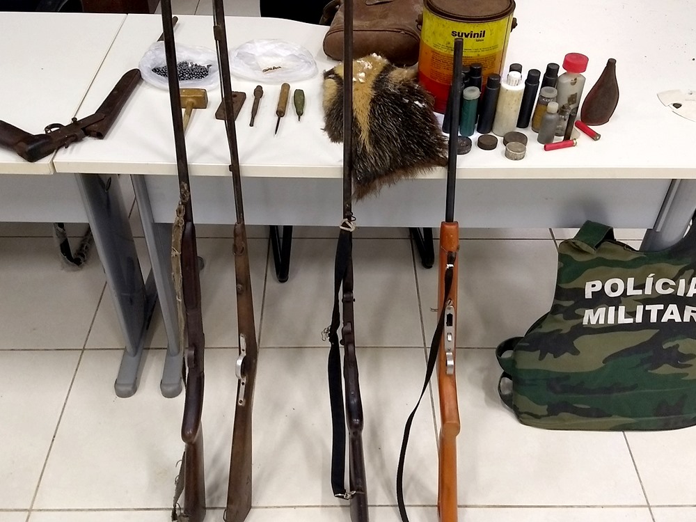 Uma equipe do Batalhão de Polícia Militar Ambiental (BPMA) prosseguiu até a localidade de Galo, zona rural de Domingos Martins, para averiguar denúncia de caça. Os policiais fizeram contato com o proprietário e fiscalizaram nos arredores e no interior da residência. Na abordagem, foram localizadas três espingardas calibre .36 artesanais, uma espingarda calibre .22 semi automática artesanal, uma garrucha calibre .36, cartuchos, 703 esferas de chumbo e 84 espoletas, além de uma pele de animal, aparentando ser da espécie tamanduá. O proprietário não apresentou qualquer documentação dos materiais.