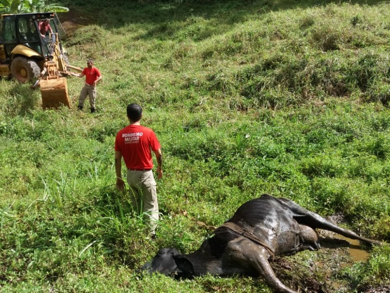 Uma equipe de militares do Corpo de Bombeiros de Marechal Floriano retirou na manhã deste domingo (27) uma vaca atolada em um lamaçal. O animal prendeu um membro dianteiro em uma pequena cratera do lamaçal de uma propriedade em Marechal Floriano.