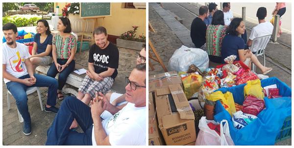 A equipe de jovens católicos do “Adote um Idoso” se encontra na plataforma da antiga estação ferroviária, atual Casa Cultural Clara Luíza, na Praça José Henrique Pereira, recebendo os donativos procedentes de moradores locais e de comunidades vizinhas que visitam a cidade.