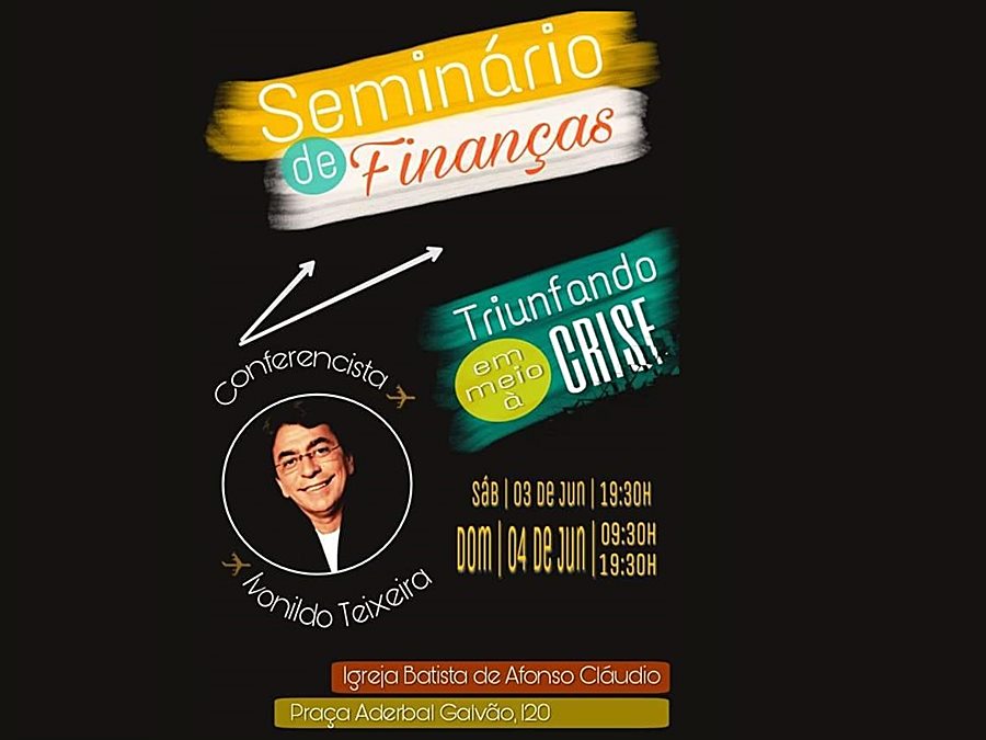 A Igreja Batista em Afonso Cláudio (IBAC) abre as portas para os consumidores, empresários e empreendedores de ramos diversos, a participarem, no espaço de reuniões, de um seminário, cujo conteúdo é de extrema importância, com o tema “Triunfando em Meio à Crise”, que será ministrado pelo Pastor Ivonildo Teixeira.O evento será nesse sábado (03), e sua entrada é franca.